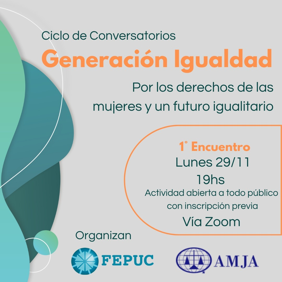Tenemos el agrado de dirigirnos a Uds. a los fines de invitarlos/as al Conversatorio Generación Igualdad: Por los derechos de las mujeres y un futuro igualitario, organizado conjuntamente por la Asociación de Mujeres Juezas de Argentina (AMJA) y la Federación de Entidades Profesionales Universitarias de Córdoba (FEPUC). El mismo se realizará el día lunes 29 de noviembre a las 19hs por la plataforma virtual ZOOM.